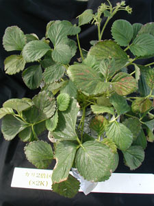写真31 古葉の葉脈間にネクロシスを生じる。 (17週目 +K8週目 エッチエス-138)  |