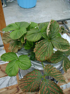 写真37 ネクロシスは古葉から始まり、新葉へと進行する。 葉身の巻き込みが見られる。 (6週目 +B4週目 エッチエス-138) |