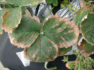 1)古葉が黒くくすみ、葉縁部付近の葉脈間から褐変(ネクロシス)が生じる(写真37)。