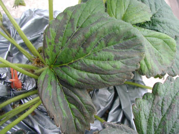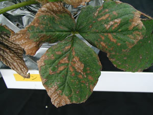 1)葉脈間に黒色のしみ状の変色が観察される(写真41)。