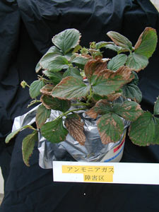 2)ガス障害の症状は類似しているが、障害部分が白化した際にアンモニアガスの場合は褐色または黄色味が残るのに対して、亜硝酸ガス障害は漂白されたように白化するとの報告がある。