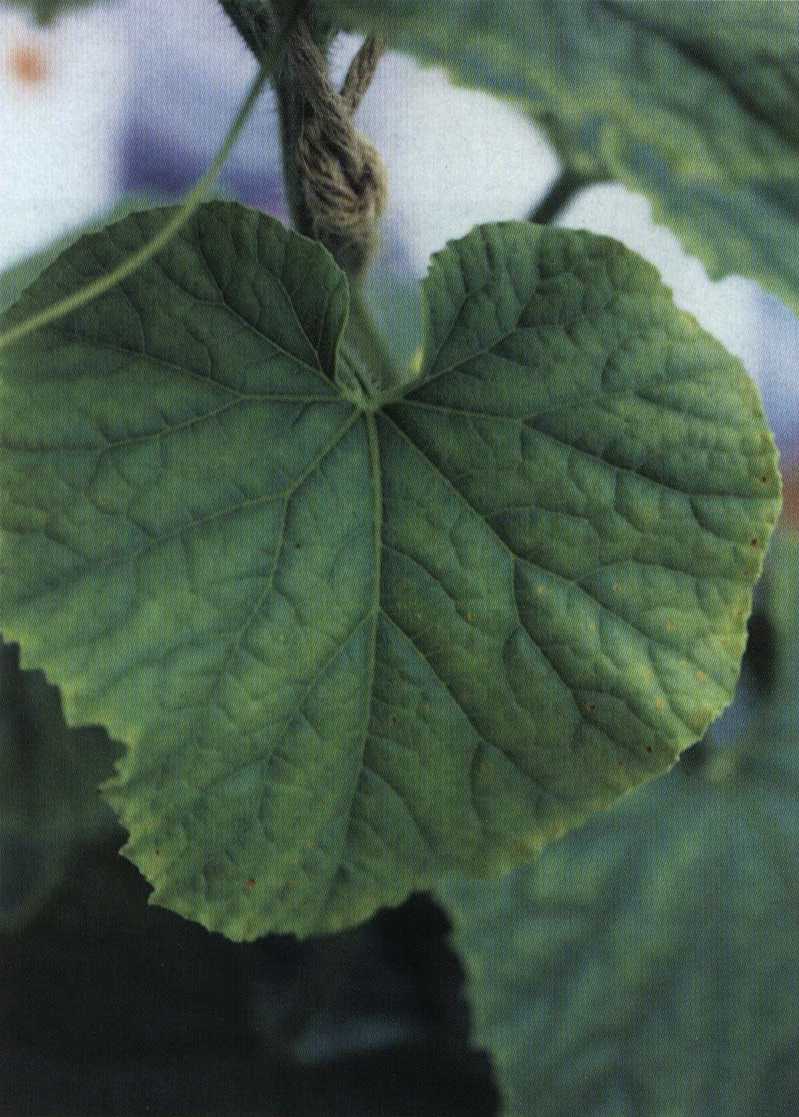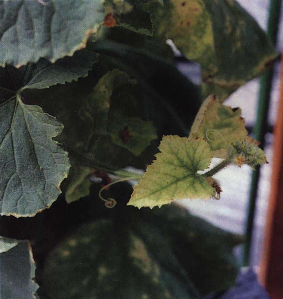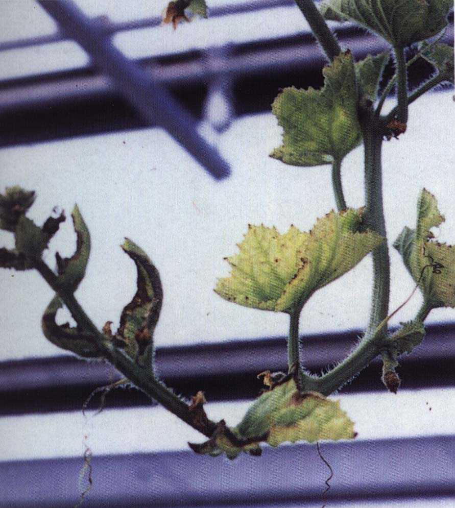 2)着果期以降のカルシウム欠乏では、上位の新しい葉に、スイカ、キュウリで見られるような葉縁部壊死斑、葉脈間黄化症状、および変形・矮小化が観察される(写真3,4)。