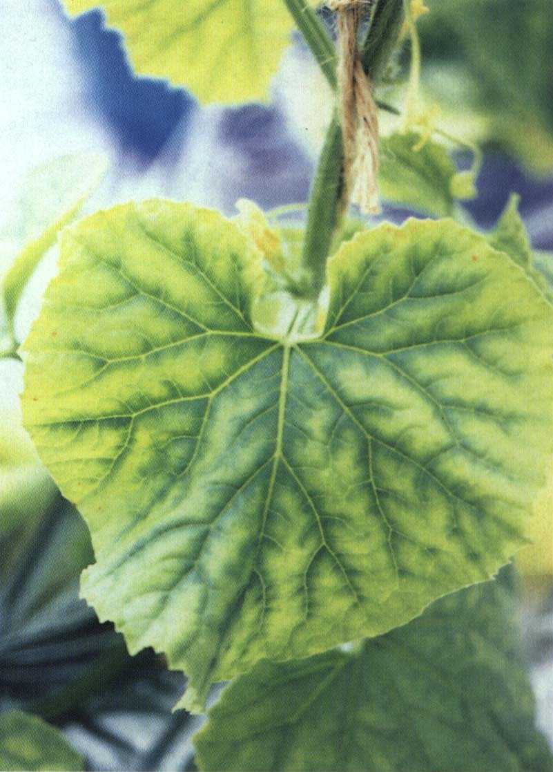 1)生育初期のカルシウム欠乏では中位から上位葉にかけて葉縁部から黄化症状が現れ(写真1)、やがて葉中央へと進み、葉中央の葉脈とその周辺の緑を残して退色する(写真2)。