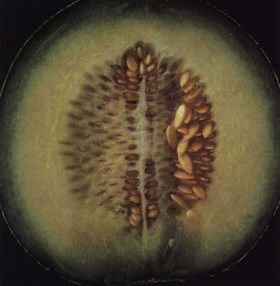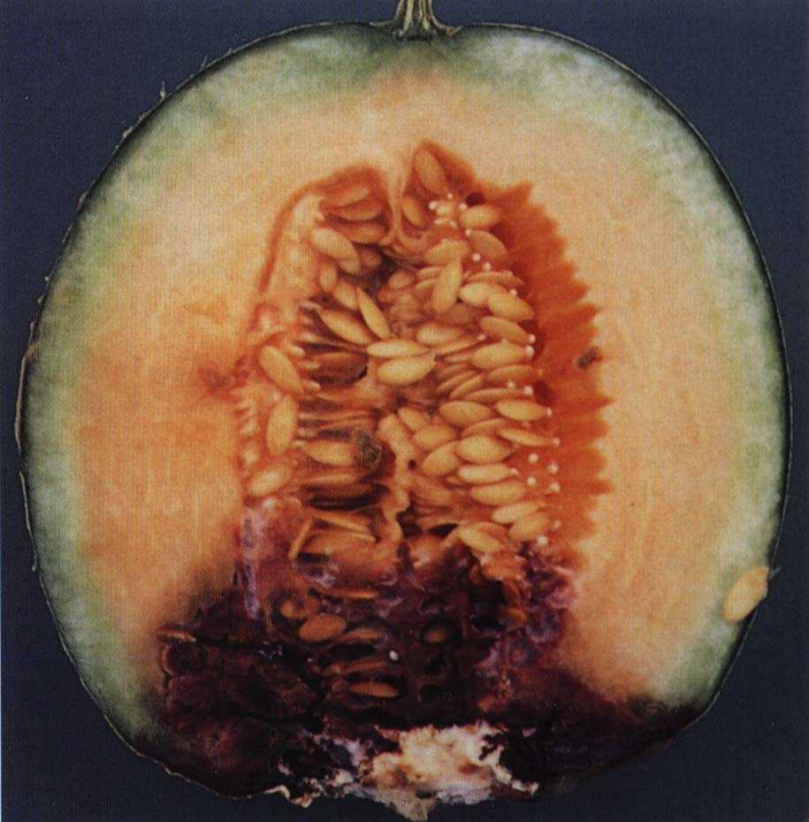 3)また、着果期以降のカルシウム欠乏では、スイカ、マクワ型メロンおよびトマトのカルシウム欠乏で観察されている果実の異常が観察される。すなわち、果実の花痕部の果肉がまだ成熟していないのに水浸状に軟化し(写真5)、やがて腐敗するいわゆる「尻腐れ」症状(写真6)が発生することがある