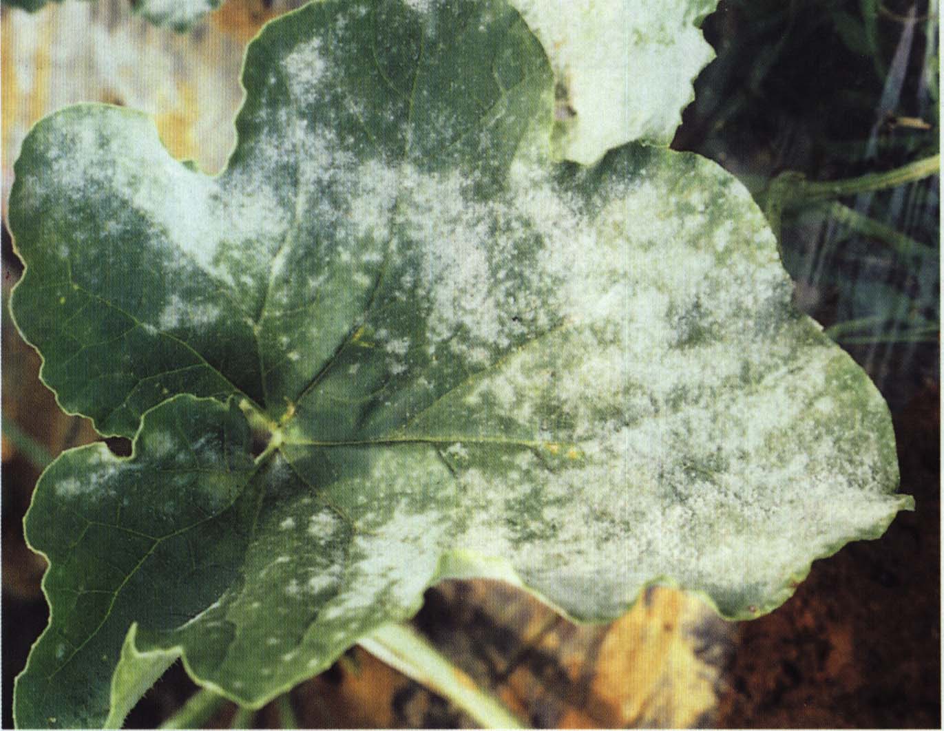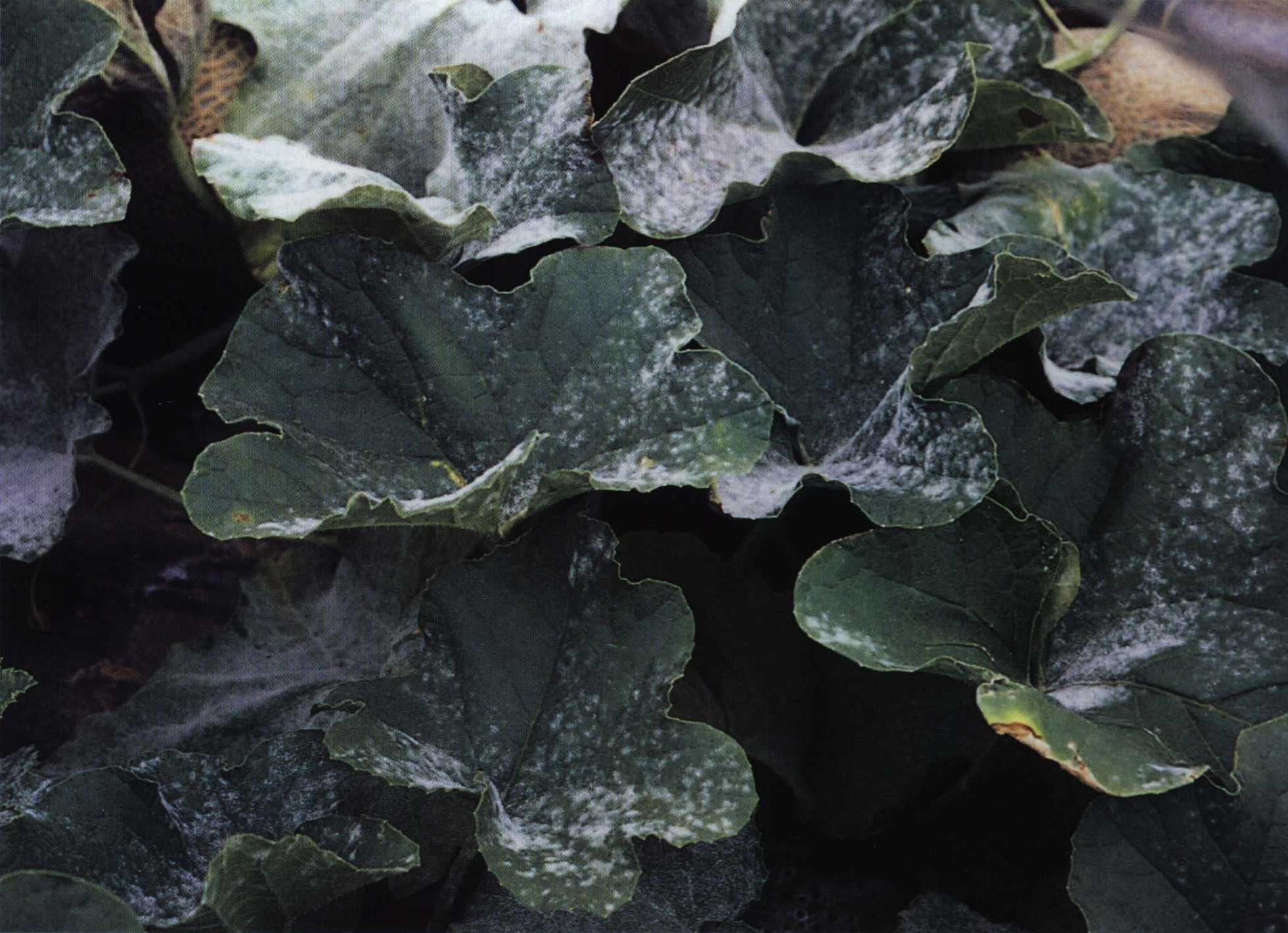 1)葉の表面にうどん粉をふりかけたような白斑が生じ(写真1)、激しい場合には葉一面に広がる(写真2)。この症状は葉柄や茎に発生することもある。
