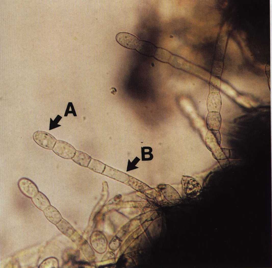 2)病斑を顕微鏡でみると、うどんこ病菌の菌糸、分生子および分生子柄(写真3)が観察される。