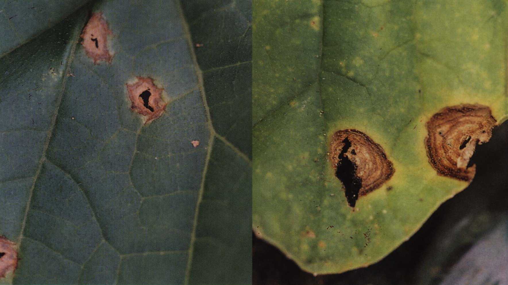 ・灰色かび病では輪紋状の病斑が現れ、中央部から破れやすい(写真右)。