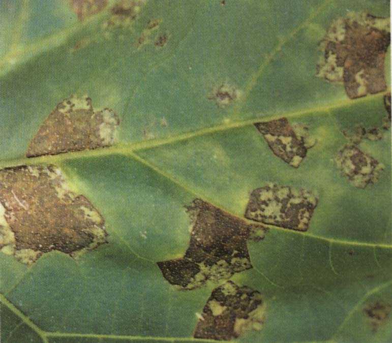 3)やがて径1〜2cm程度の黄褐〜褐色病斑に拡大する(写真3)。中央部から破れることはない。