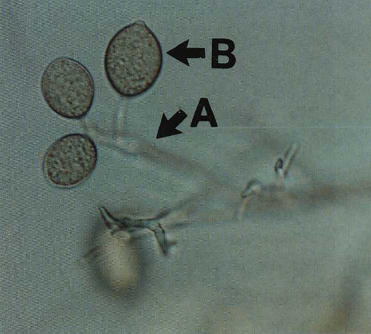 5)病斑を顕微鏡で観察すると、べと病菌の分生子柄とその先に着生した分生子(遊走子のう)が観察される(写真5)。