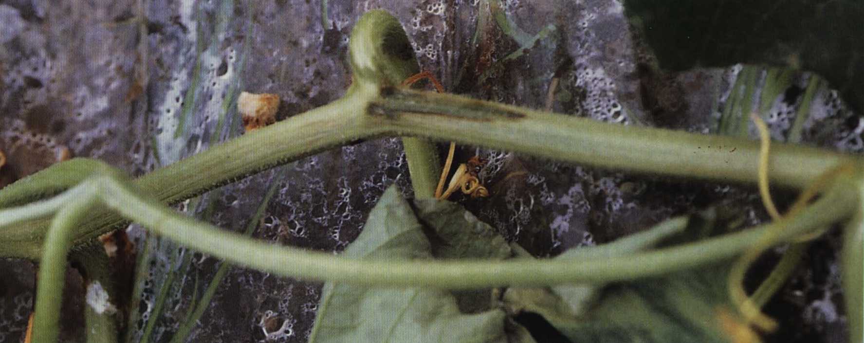 ・軟腐病でも暗緑色水浸状の病斑が茎に生じるが、つる枯病でみられるようなヤニ状の粘着物や黒色小粒点(柄子殻)は生成しない(写真)。また、軟腐病では強烈な悪臭を放つ。