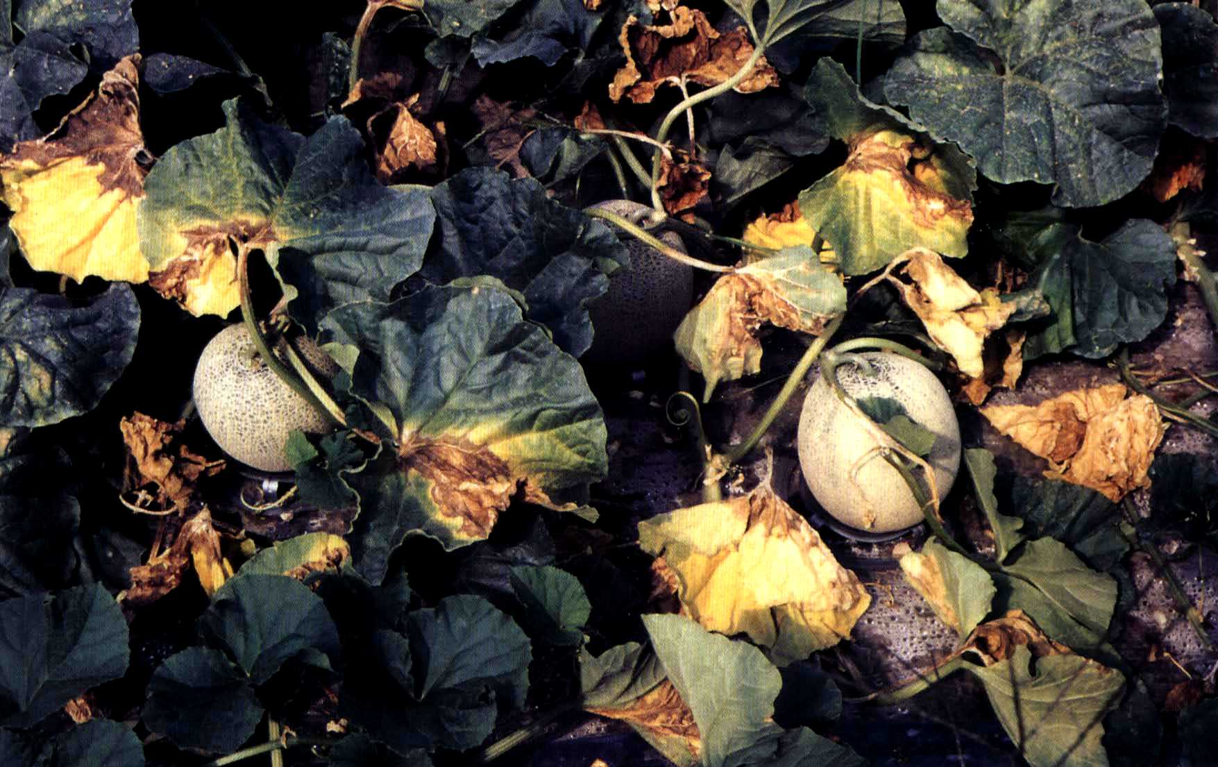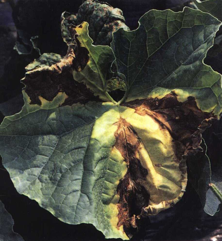 1)葉部では、葉縁部から葉脈間にかけて褐色の扇形ないしくさび形の大型病斑が生じる(写真1)。この病斑の周りは不規則な淡黄色に縁取られる。