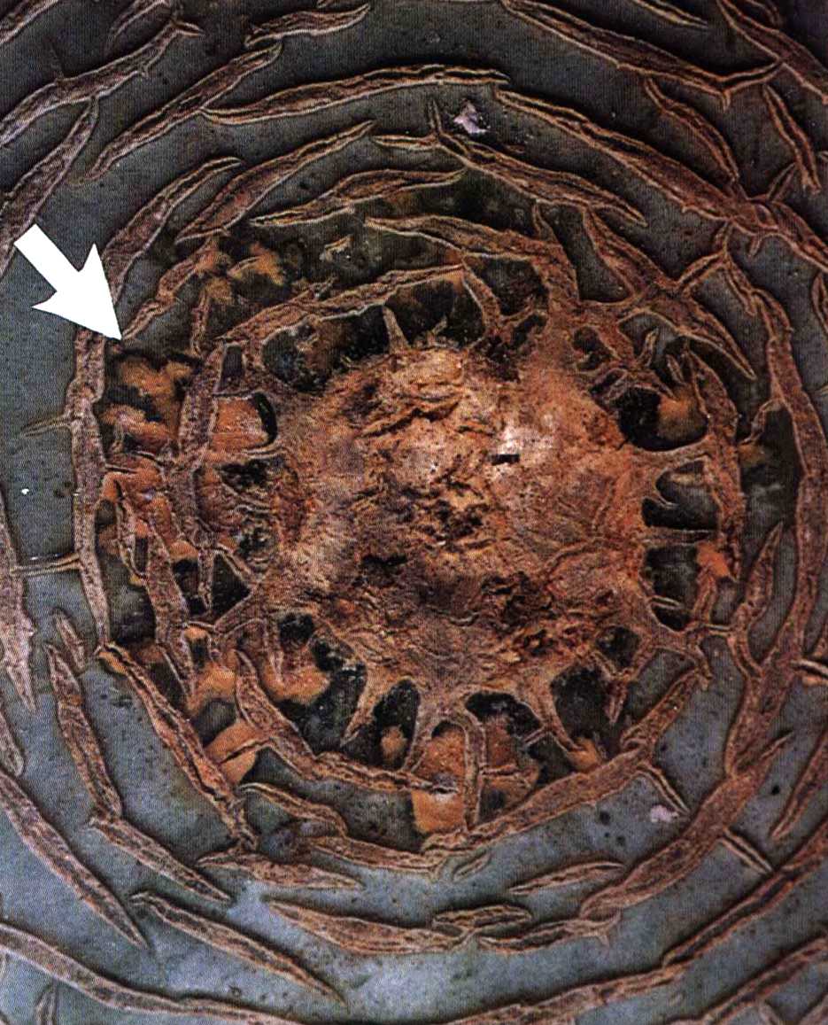 5)やがて表面が黄褐色〜灰白色に変化してくぼみ、乾いた感じとなり、病斑上に黒色の小粒点が密生してくる(写真5)。この黒色小粒点の大部分はつる枯病菌の柄子殻(写真6)であり、蛸壷状に形成される。成熟したものでは水に当たると瞬時にして開口し(写真7)、中から柄胞子が水中に無数噴出される(写真8)。