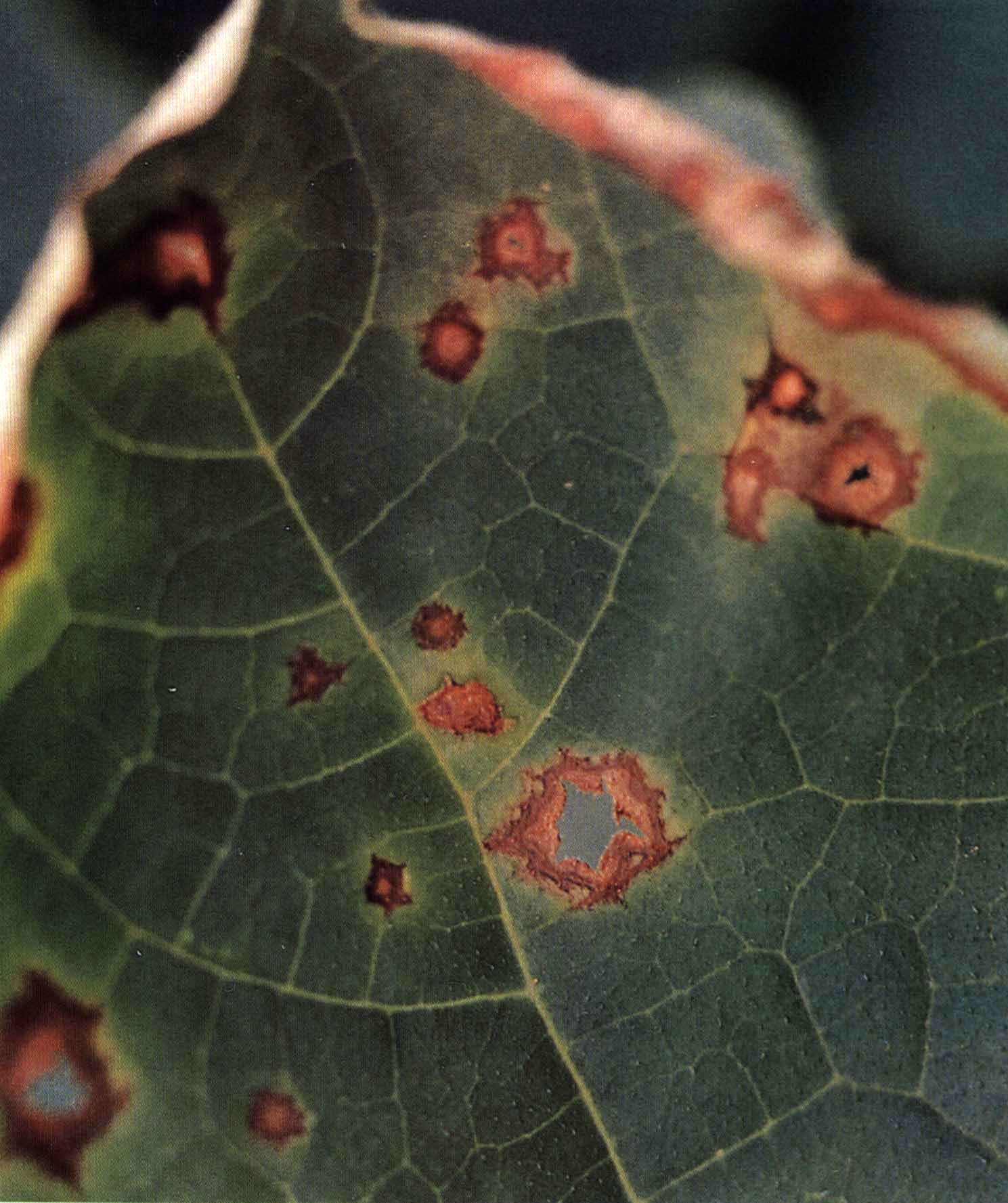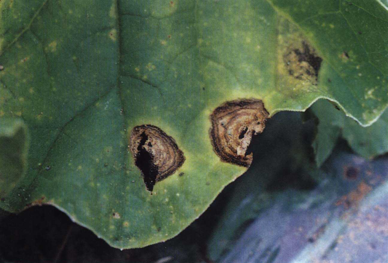 1)葉に径1〜2cmの灰褐色輪紋状の円形病斑が現れ、中央部から破れ易い(写真1)