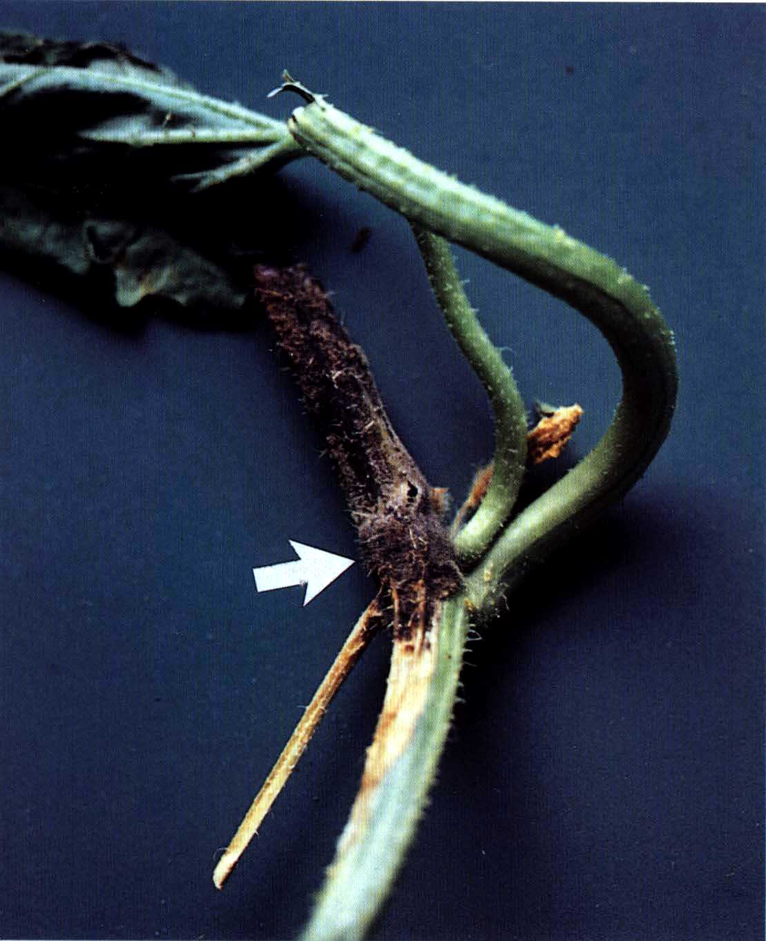 ・葉部の病斑がべと病、炭そ病(写真)、および斑点細菌病に似る。