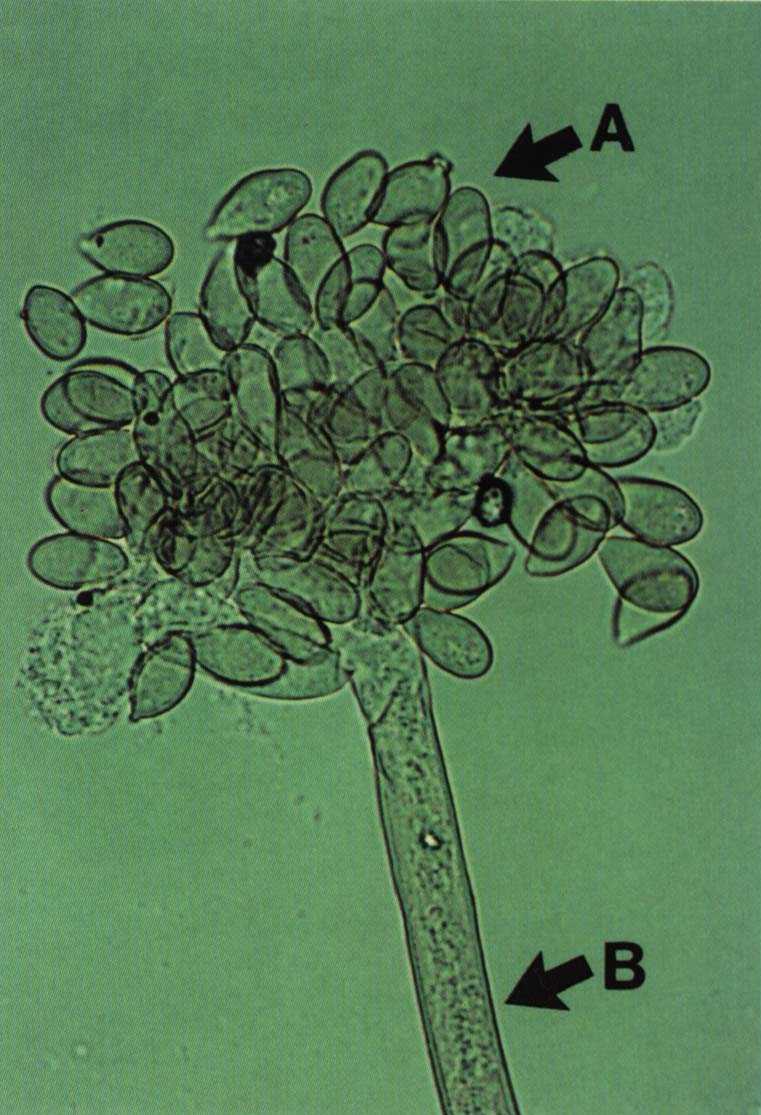 2)灰色のかびが観察されることもある(写真2)。参考までに、灰色かび病菌(Botrytis cinerea)の分生子柄上に密生する分生胞子群を示す(写真3)。