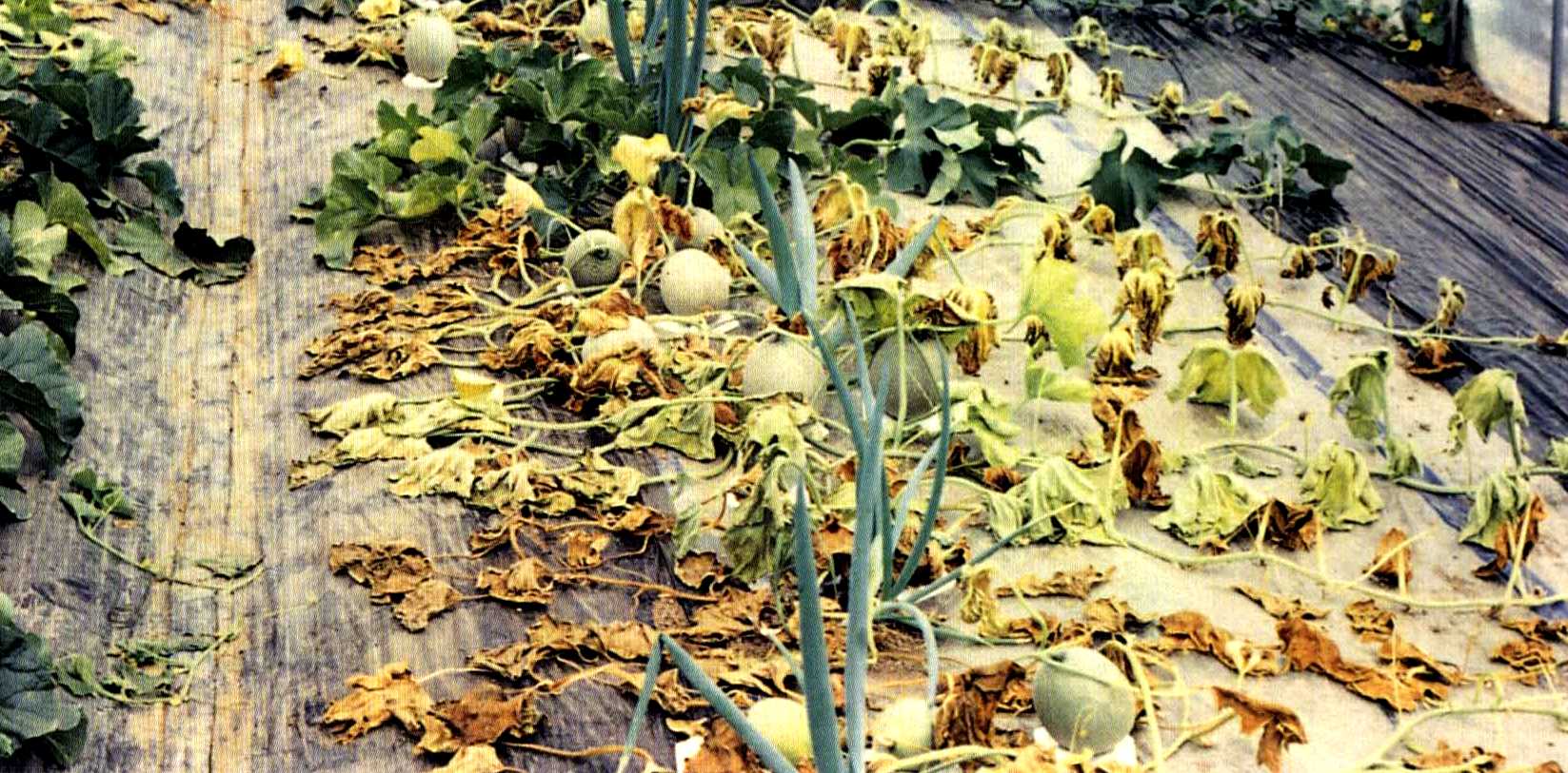 6)つる割病菌のレースによっては症状が異なる。写真8は従来のつる割病菌とは異なる新レース1・2yによって引き起こされたつる割病黄化型の発病初期の葉の病徴を示したものである。葉は肥厚し、光沢が生じている。症状が進むと下位葉より葉全面が黄化し、枯死に至る。