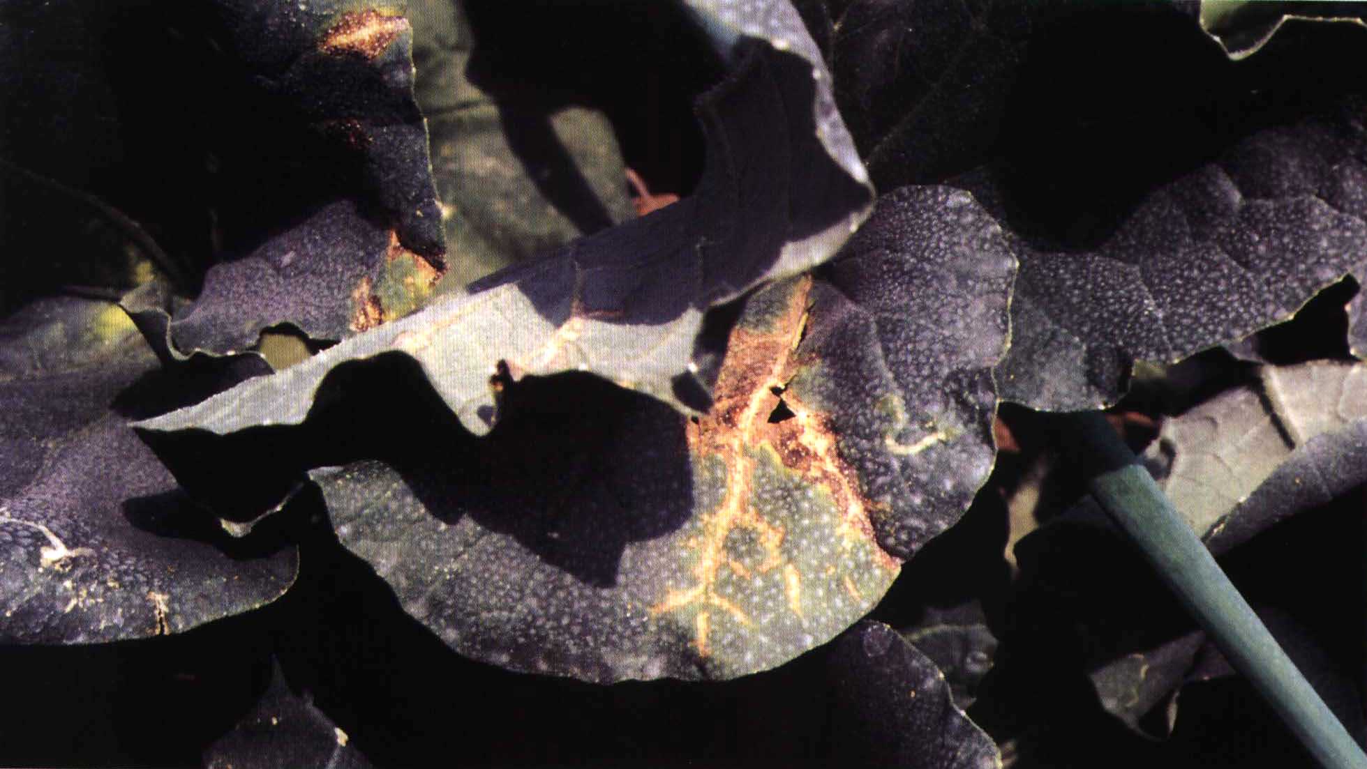 1)比較的後期の生育ステージに株もとに近い中〜下位葉に大病斑が生じる(写真1)。葉縁の葉脈に褐色のえそが生じ、やがて葉脈に沿って内部へと進展する。