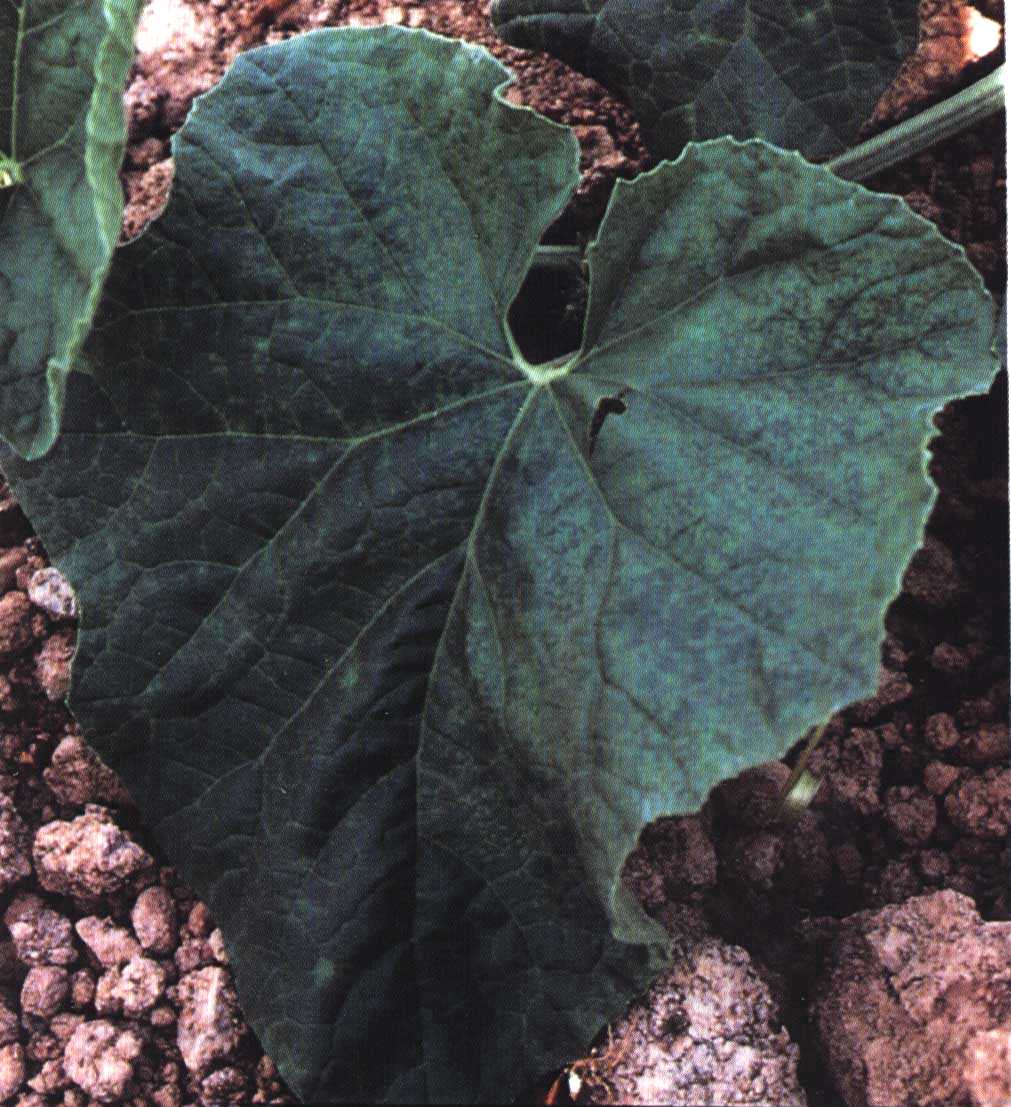 3)CGMMVでは上位および側枝などの若い葉に黄色斑やモザイクが生じるが、成葉になるとこれらの症状は不明瞭となる。写真3は上位葉の退緑斑紋を示したものである。発病株では生育が抑制され、萎縮するため、健全株と区別できる。