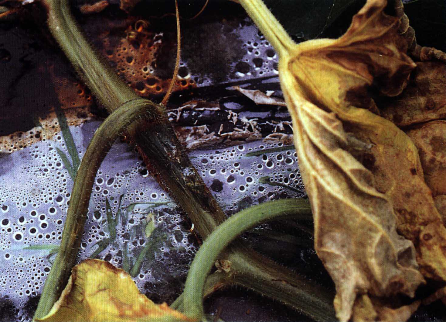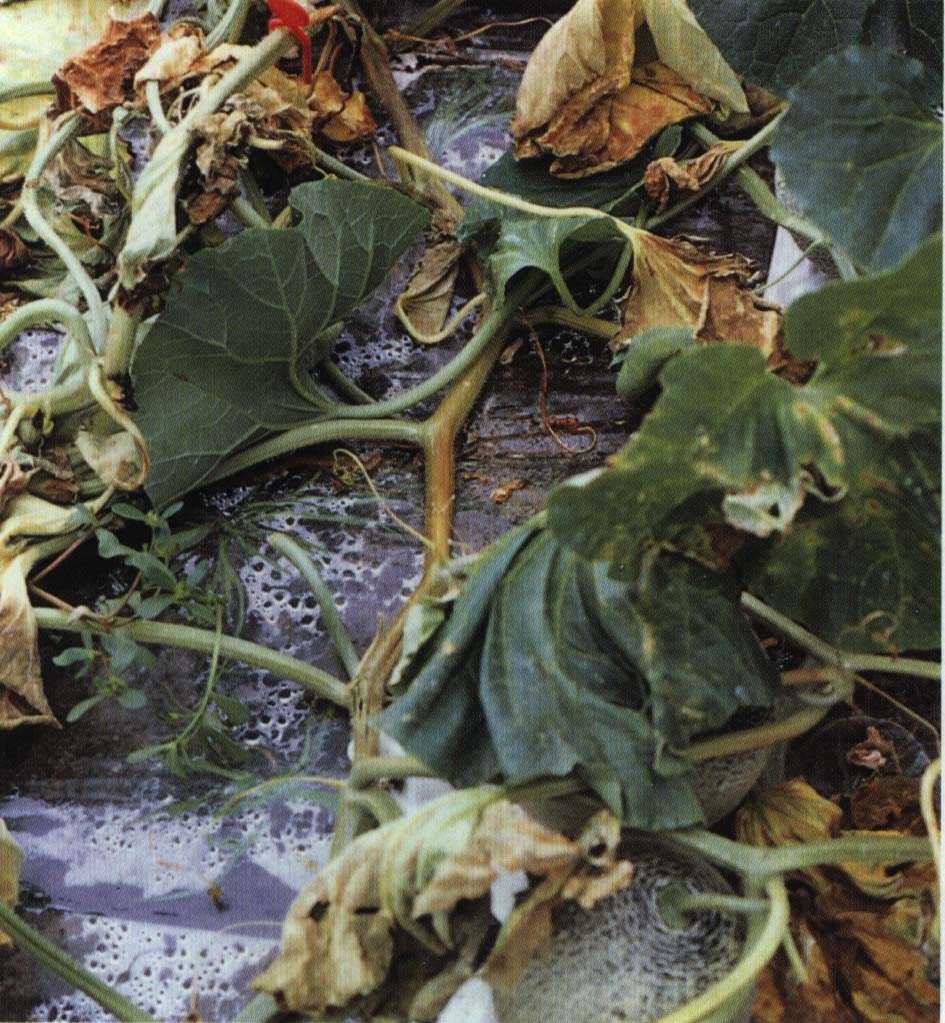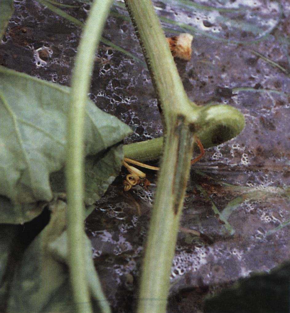 3)つる枯病の茎部の病斑に見られるようなヤニ状の粘着物の形成は認められないが、つる割病と同様導管部が褐変する。