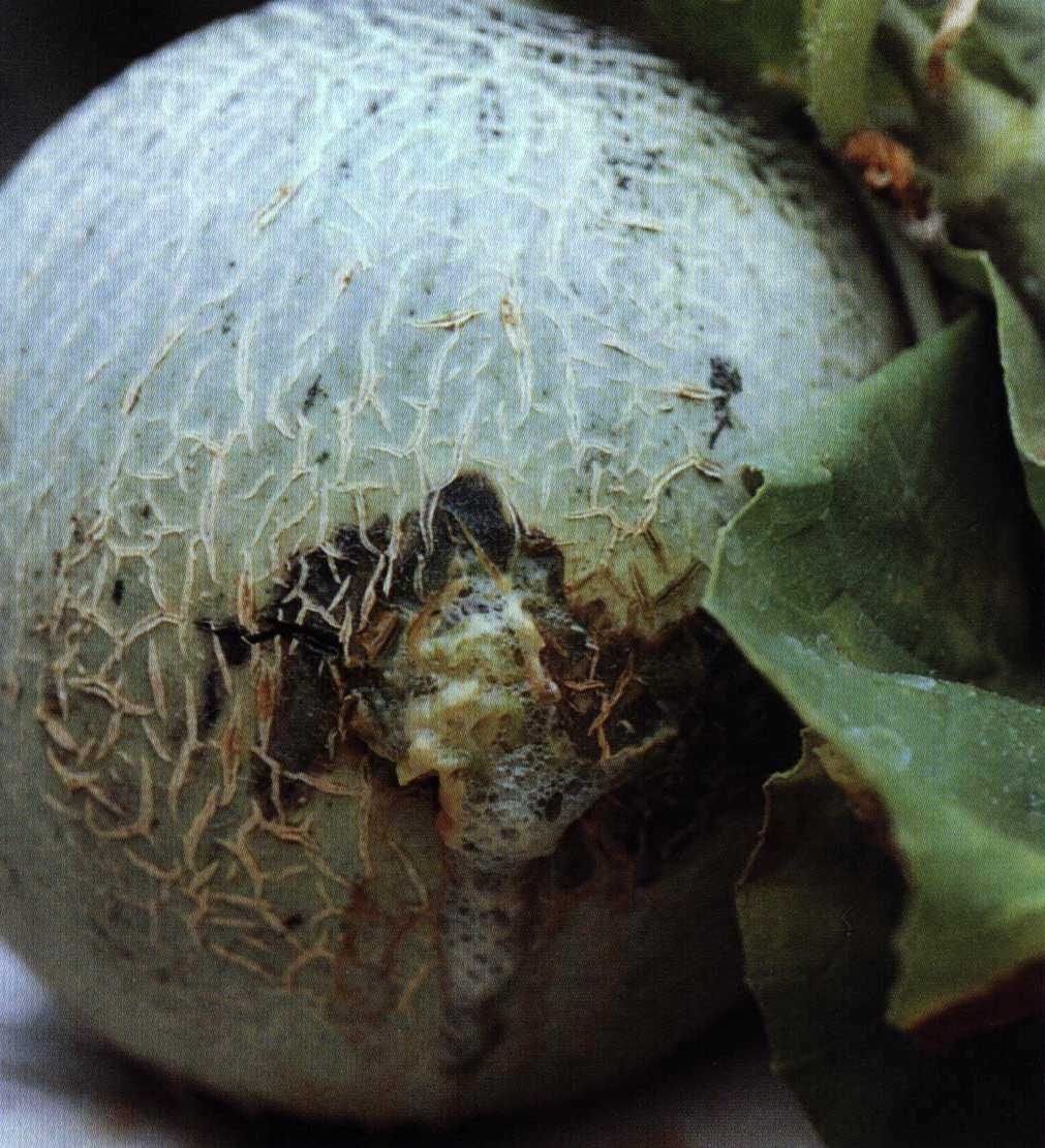 4)果実では水浸状に軟化し、腐敗する(写真4)。腐敗の進行に伴いしばしば泡が罹病部位より流出する。
