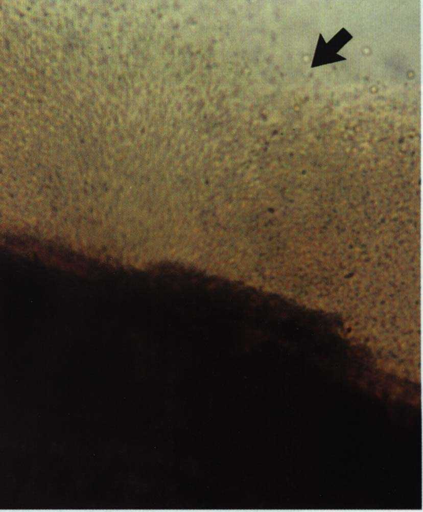 5)罹病部を顕微鏡でみると病原細菌(Erwinia carotovora subsp. carotovora)の菌泥が検出される(写真5)。