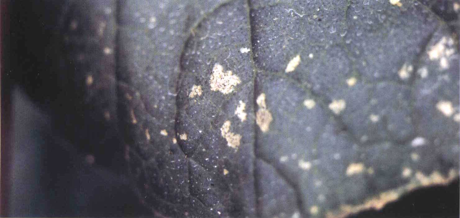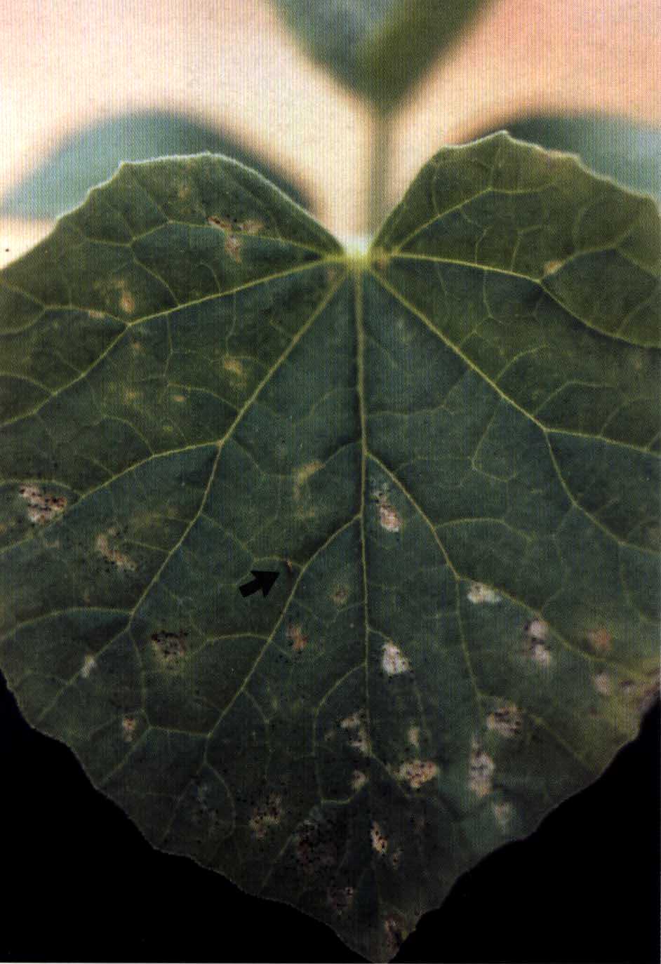 幼苗の被害状況。 径2〜5mmの黄白色〜銀白色の不定形の斑点が現れる。体長1.5mm前後のアザミウマが肉眼で観察される(矢印)。