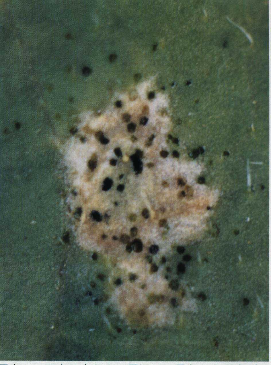 斑点の内および周辺には黒色の小斑点がみられる(拡大図)。