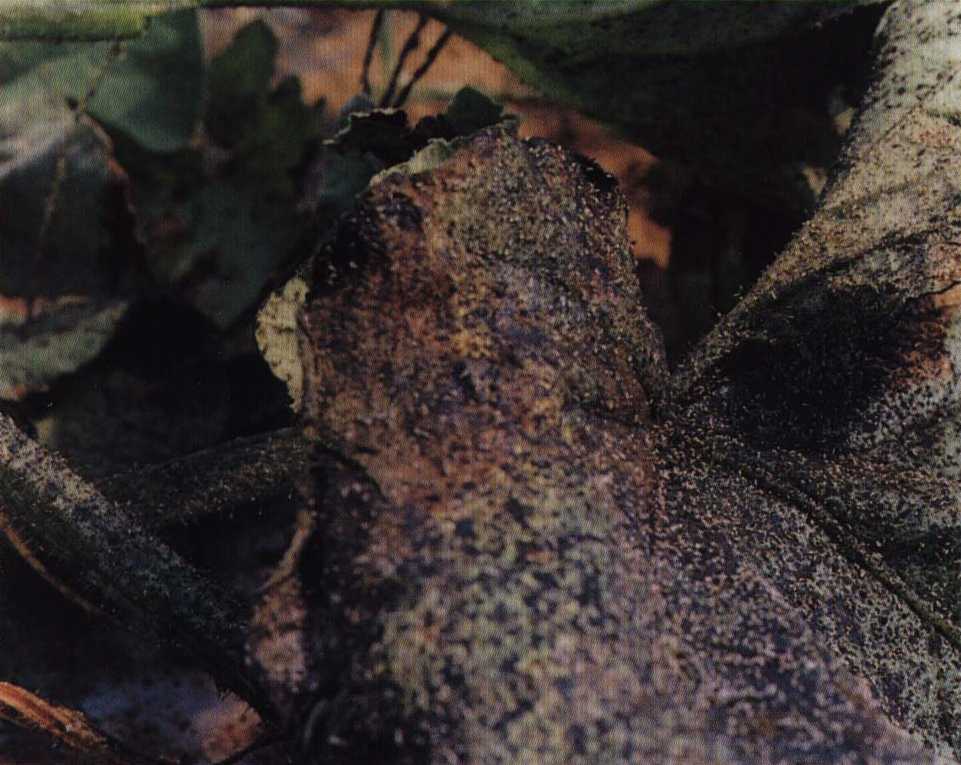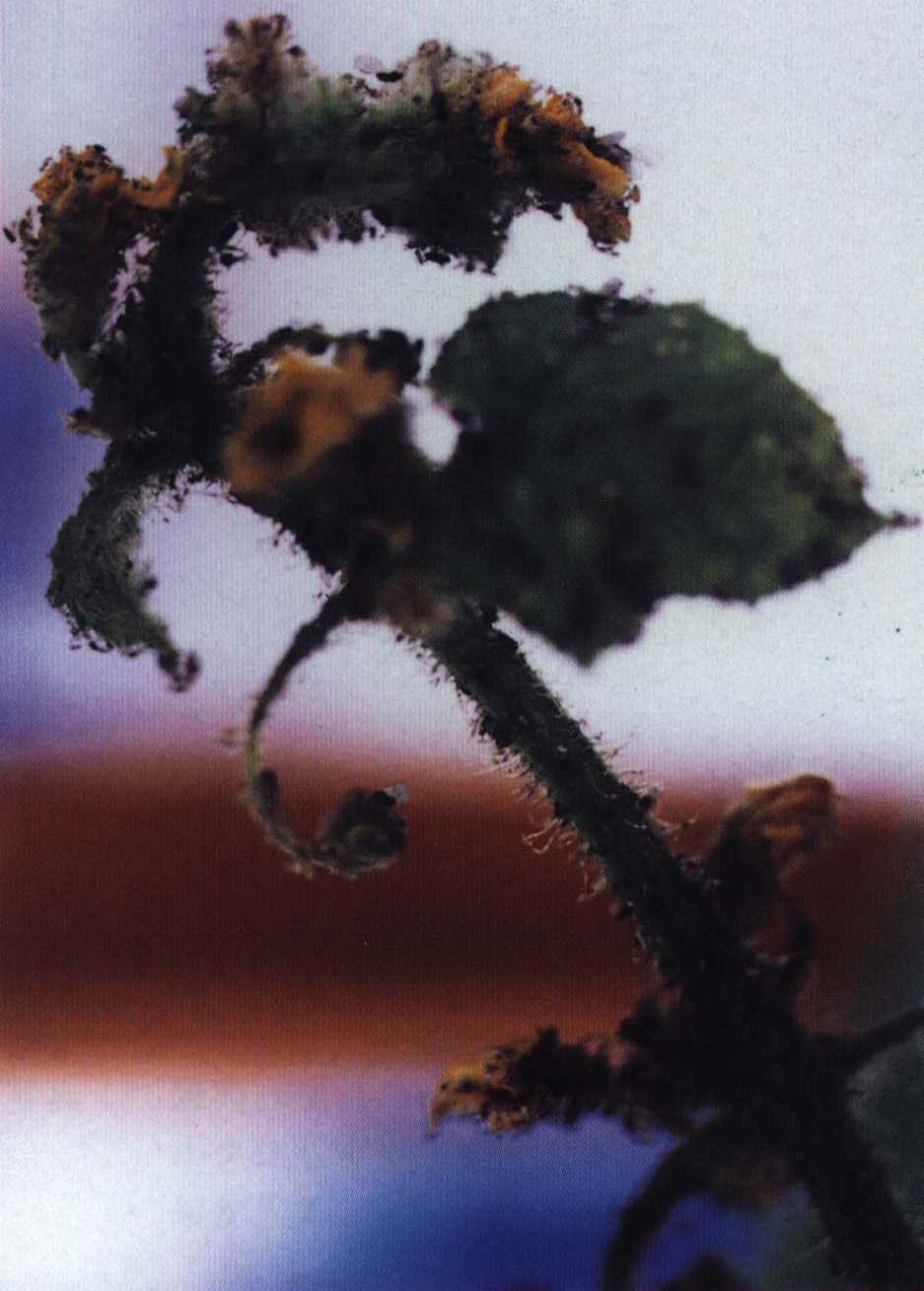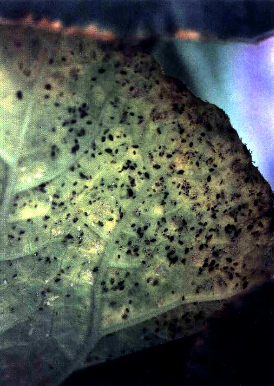 茎葉に現れたすす病。アブラムシの排泄物(甘露)によって葉、茎が汚染され、すす病が発生する。