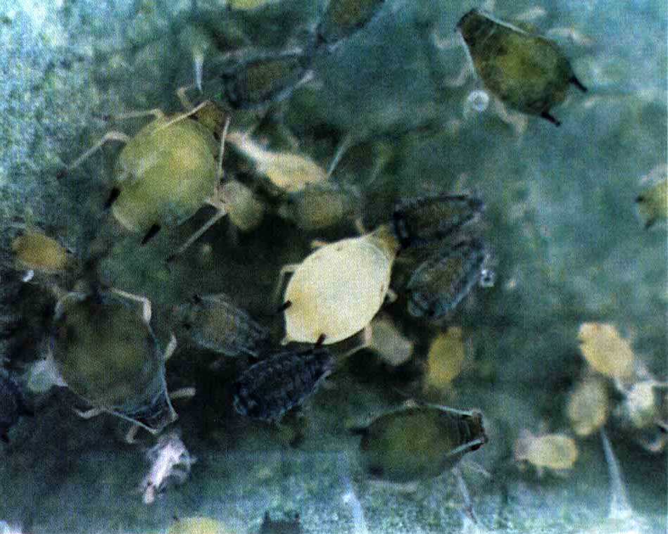 ワタアブラムシの暗緑型および黄色型の成・幼虫。(体長約1mm以下)