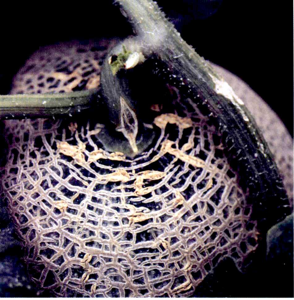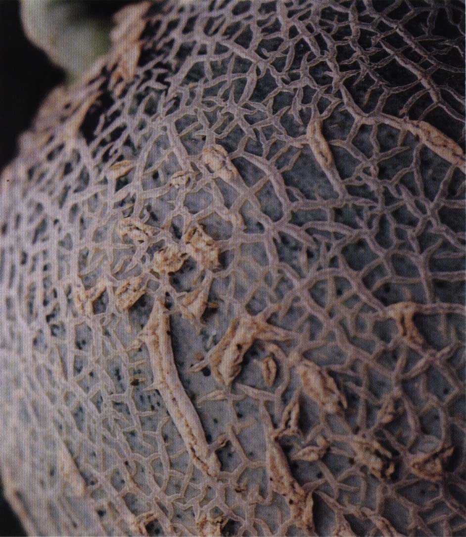 果実赤道部の被害状況。ネットの表面がコルク化してやや盛り上がり、広くて深い亀裂が入る。