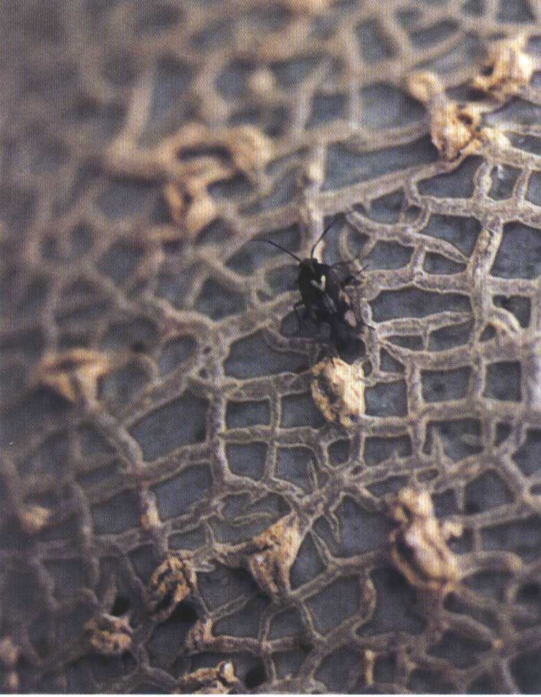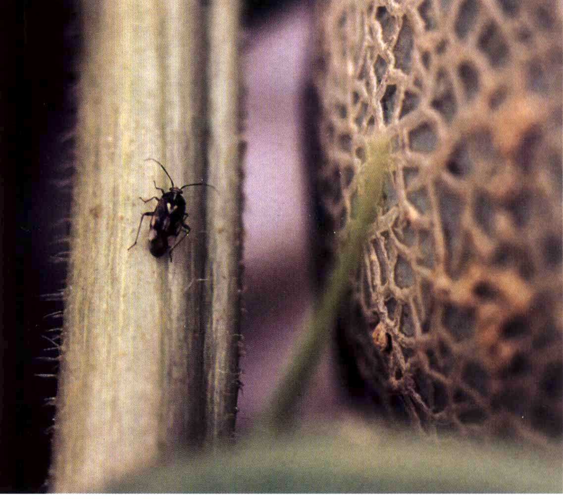 果実食害中の成虫(体長約6mm)。背中の小楯板にはV字型の白い紋がある。