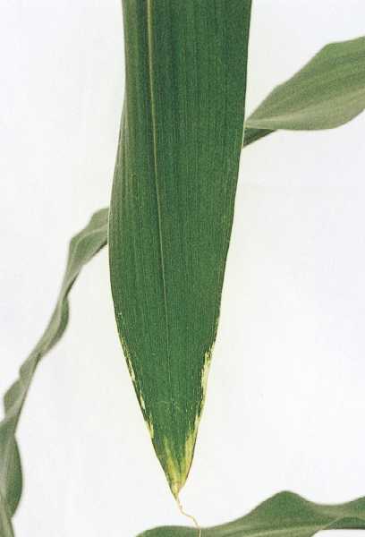 2)生育中期以降の窒素過剰では初期段階で生育初期の欠乏と同様に葉先縁が白色化する症状が上中位葉に現れる。