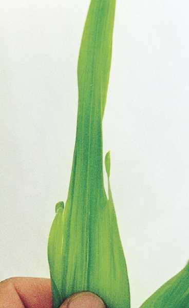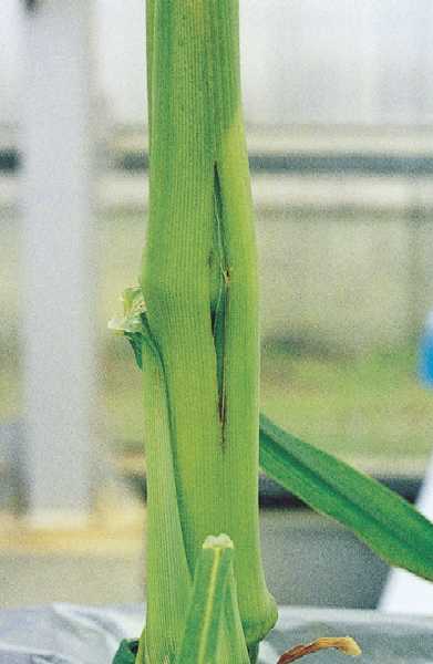 1)生育初期の銅欠乏は新葉の葉先が小さく切り裂けた症状を現す(写真39)。やがて、下位葉の葉鞘部には亀裂が観察される(写真40)。