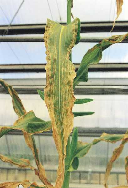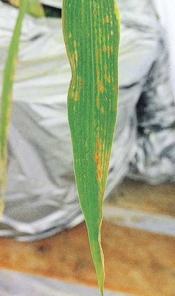 2)中下位葉の葉脈間には不規則な赤褐色斑点が現れ(写真41)、亜鉛欠乏を誘発する。