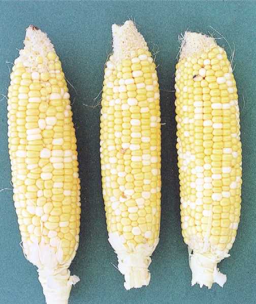 5)銅欠乏の雌穂は穂長が短く、中央部が太く、穂柄側がやや細くなると共に、著しい先端不稔や一部に裂粒の発生が見られる場合がある(写真43)。