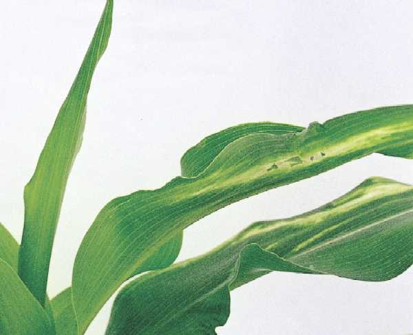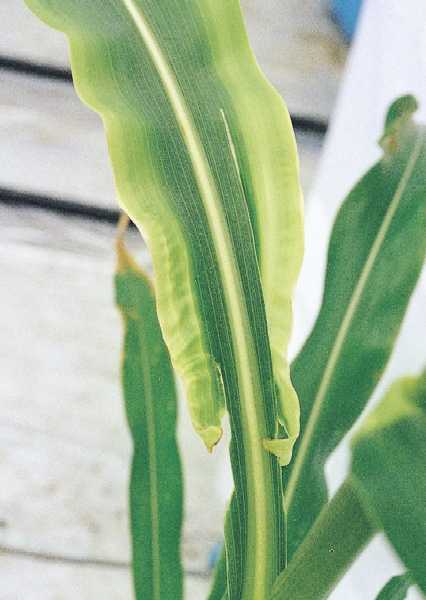 写真44 上位葉の葉身中央部に表皮剥離状の白色斑が帯状に現れ、