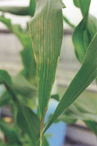 写真46 中下位葉の葉脈間に発現した不規則な赤褐色斑点。