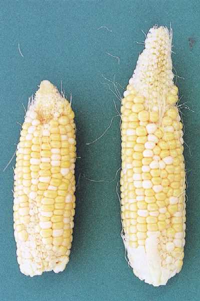 6)亜鉛欠乏の雌穂は穂長が短く、穂先が細く、著しい先端不稔がみられると共に、穂柄側にも列状の着粒不良が見られる場合がある(写真48)。
