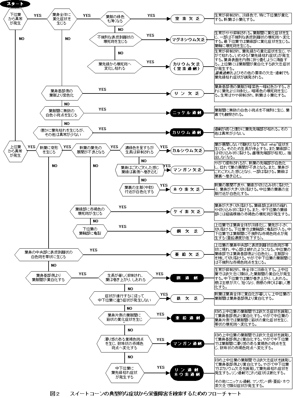 図2 スイートコーンの典型的な症状から栄養障害を検索するためのフローチャート(45KB)