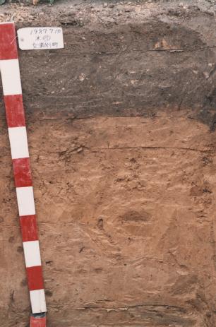 この断面は、約3万年前に屈斜路カルデラから流れてきた軽石流堆積物を母材とする土壌で、表層にはより新しい時代の降下火山灰が少し混入し、腐植が集積しています。下層土は軽石流堆積物が風化し、黄色の粘質層になっていますが、さらに下層は砂質です。保水性は高いのですが、この地域は降水量が少ないため注意を要します。下層土の粘土化が進んだり、堅く締まってくると透排水性が悪化することもあり、心土破砕などの排水対策を必要とします。リン酸吸収係数はあまり高くなく、通常の肥培管理を行う上で、土壌化学性に問題は少ないと思われます。