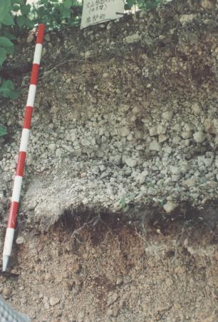 この断面は駒ヶ岳系の粗粒火山灰(大小の粒径の軽石)からなる、非常に新しい土壌です。表層0-20cmの軽石層は恐らく駒ヶ岳a層(1929年噴火)で、20-80cmは駒ヶ岳c1層(Ko-c1,1856年噴出,上部は弱い腐植層)、80cm以下はKo-c2層(1694年,最も大規模な噴火で遠く根釧地方まで分布,上部は腐植層)で、c1,c2層はいずれも軽石流堆積です。