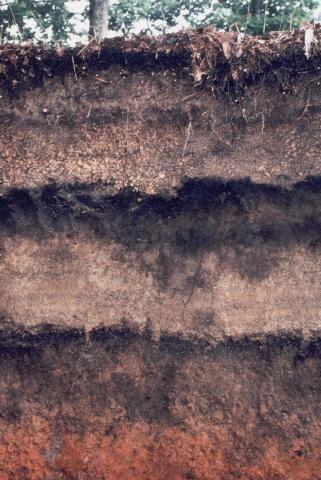 この断面は樽前系火山灰が累積した典型的なもので、上から順にTa-a(0-22cm),Ta-b(22-45cm),Ta-c(45-72cm腐植層,72-102非腐植層),Ta-d(102-138cm,腐植層,138-195cm非腐植層)となっています。上の2層が粗粒火山灰層で、Ta-cは軽しょう質、Ta-dの非腐植層は非常に風化が進んだ赤褐色の特徴的な軽石層です。過去4回の大規模噴火があり、Ta-aは1739年で遠く根釧地方まで分布し,Ta-bは1667年,Ta-cは2500~3000年前、Ta-dは8000~9000年前で,いずれも十勝地方まで分布しています。