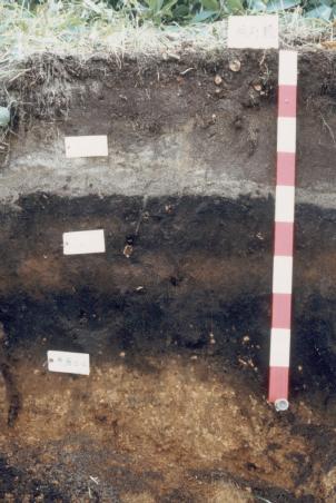 この断面は03-16と同じく樽前系粗粒火山灰土壌ですが、Ta-b,Ta-d層がなく、Ta-c層の直下に恵庭a層(En-a)があります。上から順にTa-a(0-42cm,細かい軽石を含む火山砂,上部20cmは弱腐植層)、Ta-c(42-48cm腐植層,48-68cm弱腐植層)、En-a(68-87cm腐植層,87cm以下腐朽軽石を含む黄褐色のローム層)となっています。