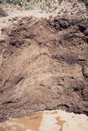 この断面は、全層樽前a粗粒火山灰層からなる、メロン畑の土壌です。この地方のメロン栽培は堆きゅう肥を大量に投入して行うため、深さ80cmに見られる湧水は濁っています。前出の砂質土壌(砂丘未熟土)と同じく、スイカ、メロンなどウリ類やナガイモなどがこの土壌の特性をうまく利用して栽培されています。