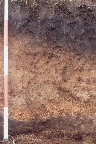 この断面は主に摩周系火山灰からなり、30cmまで腐植層で、最表層は樽前a層、次いで矢臼別層(Ta-cの可能性、約3000年前)、摩周f1層の腐植層(13~30cm)で、カムイヌプリ系の火山灰(Ka-1a,2a)も混在しています。30cm以下90cmまでは腐植層はなく、6500年~7200年前に噴出した摩周系の火山灰が上から順にMa-f1,Ma-f3,Ma-g,Ma-h,Ma-i,Ma-jの6層が累積しています。特に、Ma-iはオレンジ軽石として、Ma-jは青灰色の灰として特徴があります。90cm以下のローム層はMa-lと思われます。