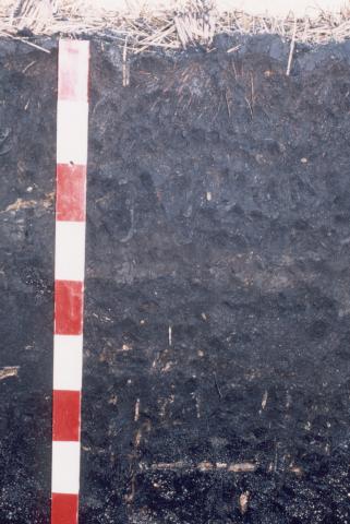 この断面は沢地に形成されており、分解が進んだ粘土混じりの泥炭層の上に樽前系の粗粒火山灰が積もったもので、30cm以下からグライ層となっています。表層(0-30cm)は火山灰(Ta-a)の他に氾濫による粘質土も混ざっています。以下、30-50cmは泥炭混じりの黒褐色の粘土層で、50-83cmは粘土、火山灰混じりの低位泥炭層、83-88cmには火山砂(Ta-c?)が薄く挟在しています。