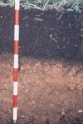 この断面は、中央農試裏手の台地末端地形にある、ゆるい傾斜のリンゴ園の土壌です。表層35cmは腐植が集積して黒褐色をしており、これは表層に古い火山灰が混入しているためと考えられます。下層土の色は黄褐色で、60cm以下の層には礫が含まれ、腐朽した砂岩も見られます。土の母材(母岩)は第三紀層の砂岩、頁岩類です。