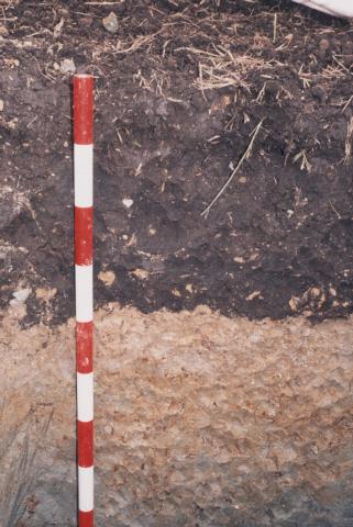 この断面は、70cm以下がグライ層となっているもので、典型的なグライ台地土ではなく、灰色台地土に近いタイプです。ほ場の均平化工事を受けており、表土と下層土の境界は明瞭です。35cm以下の下層土は非常に硬く、黄褐色で地下水湿性を示す管状斑紋が見られます。