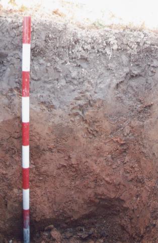 この断面は、下層土の最も赤味の強い部分の色が5YR5/8です。赤味の強い色は鉄の酸化物が多いためで、これは火山活動による熱の作用でできたものとされています。この他に、非常に古い時代の熱帯気候条件下で生成された赤色土が、化石的土壌として温存されて現在に至っているものもあると考えられています。