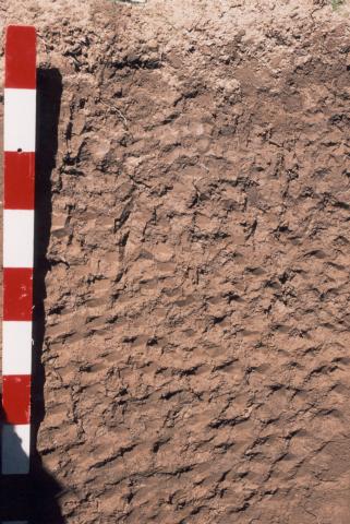 この断面は、夕張川流域の粘質の沖積土壌です。表土の腐植含量は少なく、苦土含量が全層にわたって非常に多い特徴があります。これは夕張川の上流部に蛇紋岩地帯が有るためです。このため、塩基飽和度やPHも高い値となっています。ただし、第2層(15-30cm)は非常に硬くて透水性が悪く、これがほ場の排水性を低下させていると思われます。65cm以下の層は硬度16mmで柔く、透水性も良好となっています。